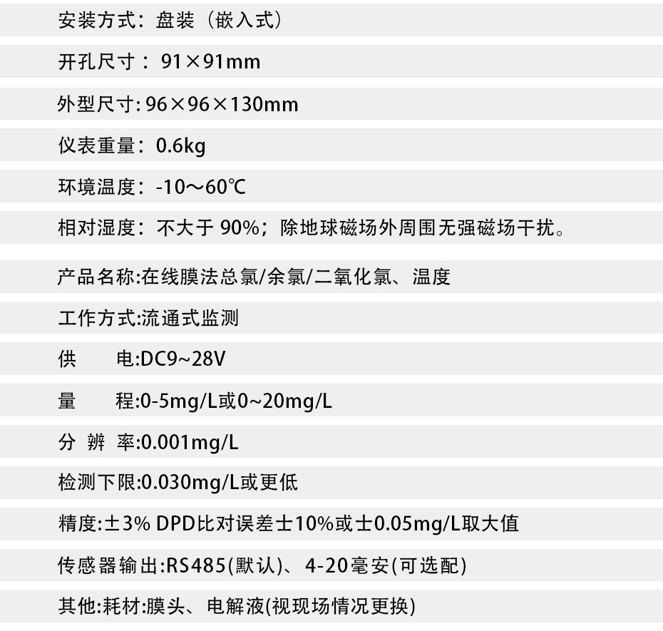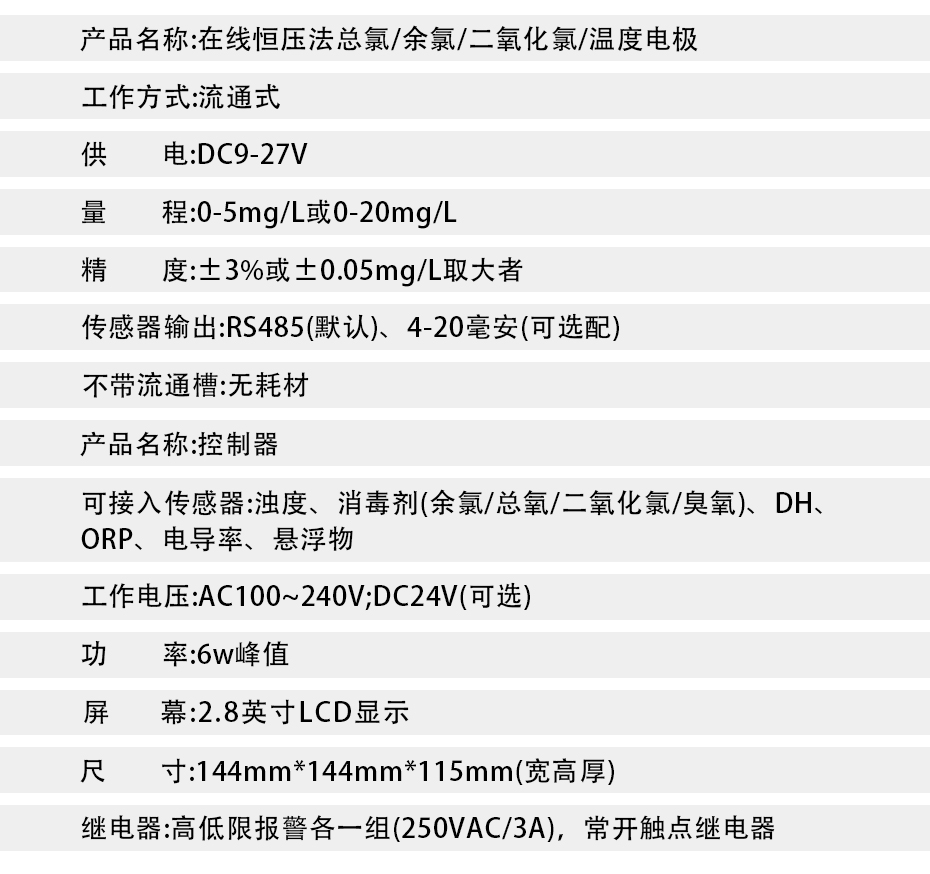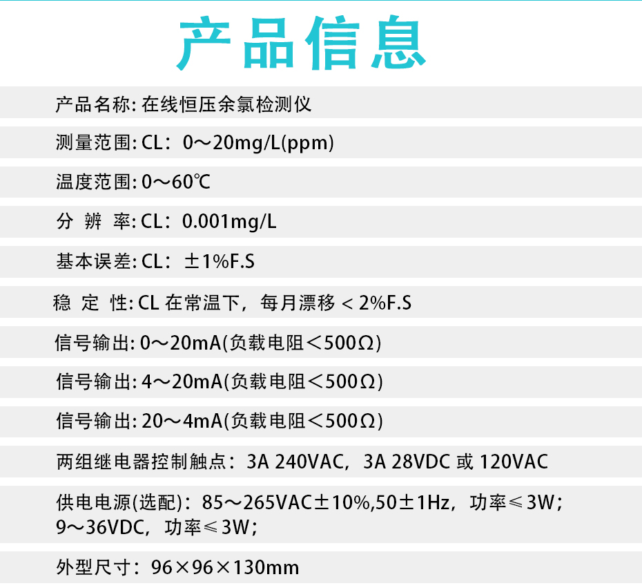 水質余氯在線測控儀,即水質在線余氯計,是采用非膜式恒電壓傳感器,無須更換膜片與藥劑,靈敏度高,信號響應迅速,測量準確、性能穩(wěn)定、維護簡單。該水中余氯測控系統(tǒng)具有使用方便、準確度高、經(jīng)濟的特點。運用這一系列的分析技術,確保儀器長期工作的穩(wěn)定可靠性和準確性。具有中文菜單式操作、485通訊等功能。